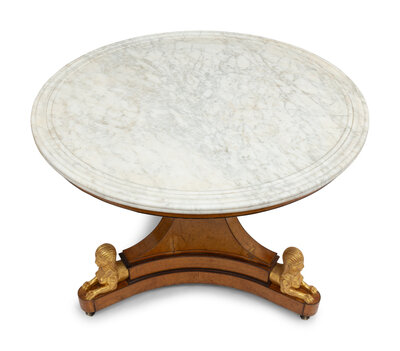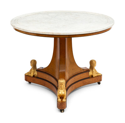 A Charles X Amboyna, Amaranth and Parcel Gilt Marble-Top Center Table
