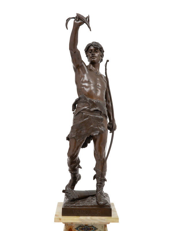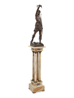 Height of bronze 36 1/4 inches, together with an associated champlevé mounted onyx pedestal, height 40 inches.