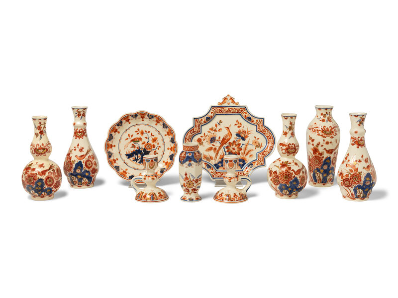 comprising six vases of varying form and size, a pair of candlesticks, and two plates; 10 items total.