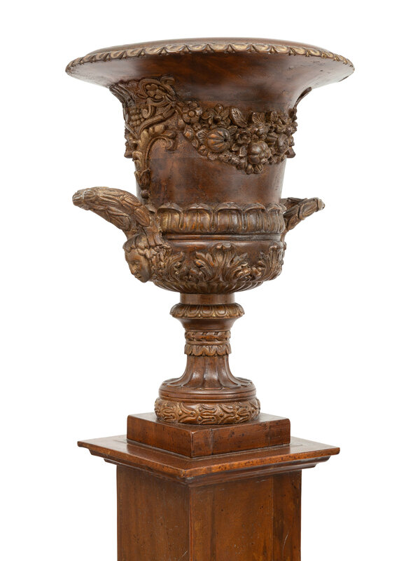 A Pair of Neoclassical Style Carved Campagna Form Urns on Pedestals
