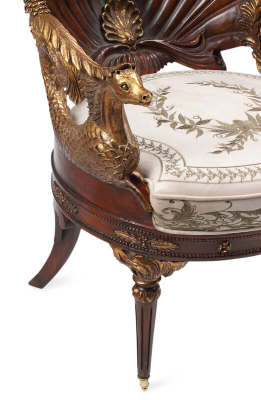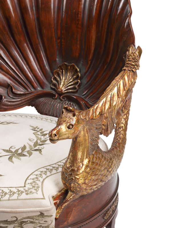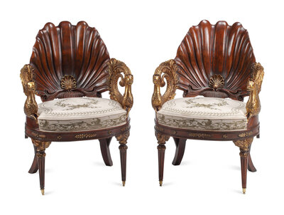 A Pair of Neoclassical Style Carved Walnut and Parcel-Gilt Shell-Form Armchairs