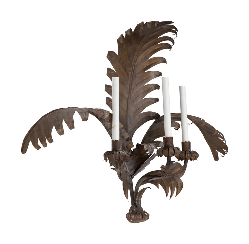 A Pair of Italian Tole Palm Frond Three-Light Sconces
