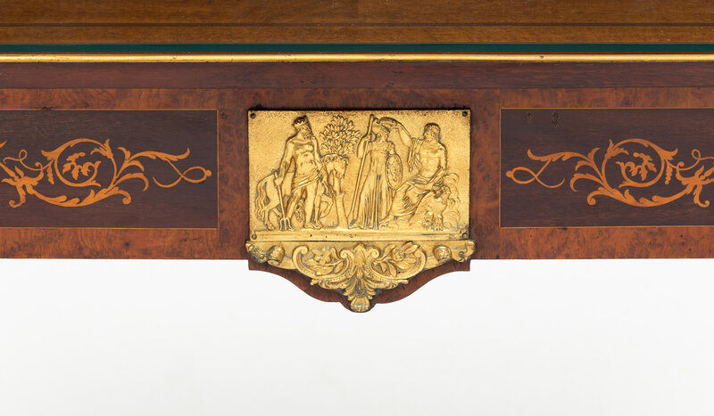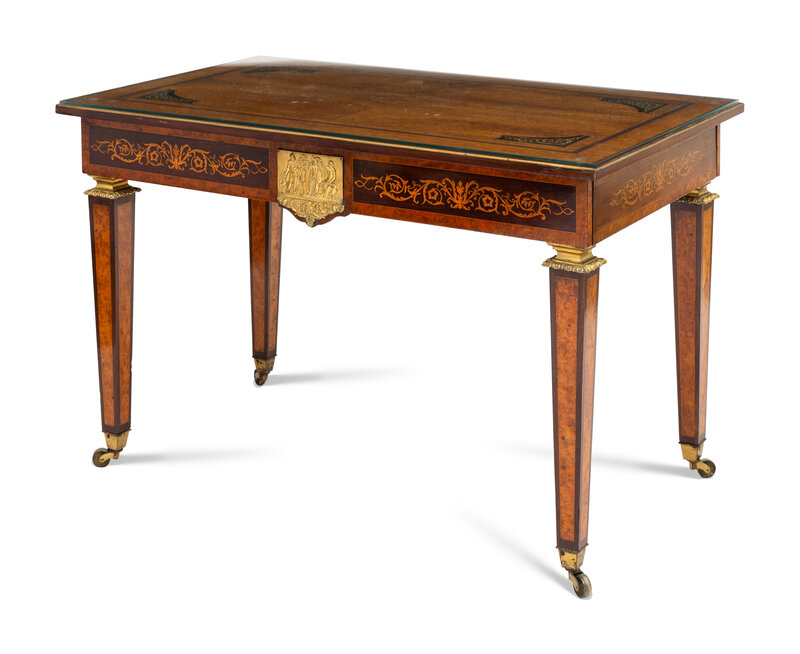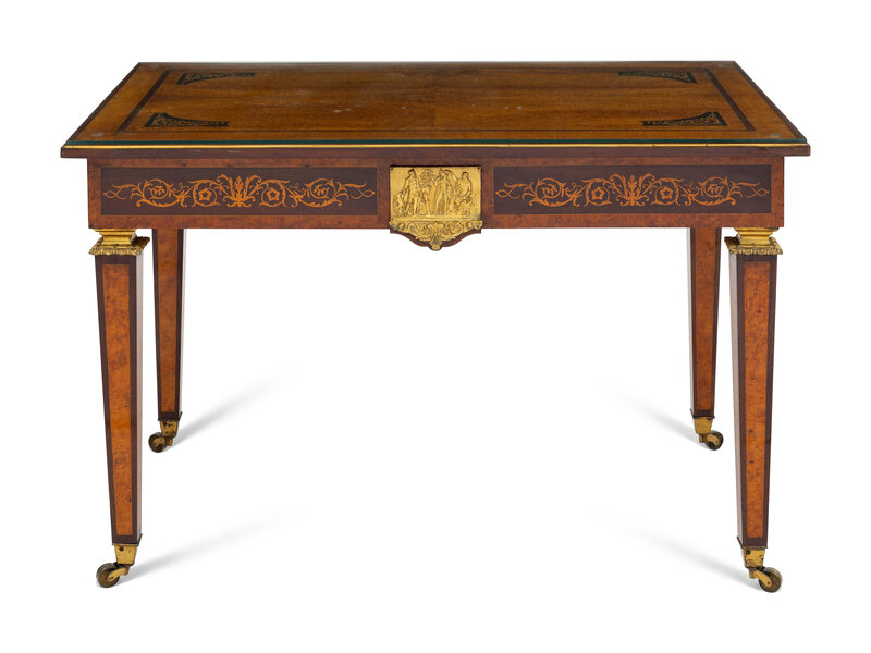 A Victorian Gilt Metal Mounted Amboyna and Marquetry Center Table