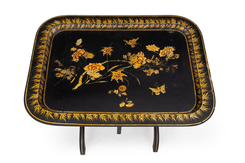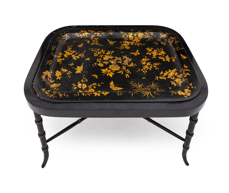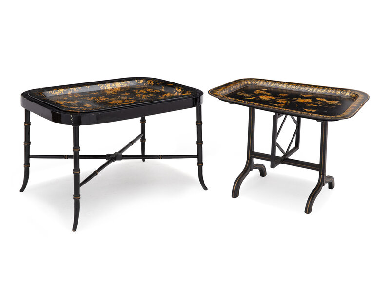 Two Victorian Parcel-Gilt Papier Mache Tray Tables and Five Tole Peinte Trays
