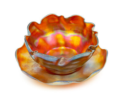 A Set of Six Tiffany Studios Favrile Glass Bowls and Saucers