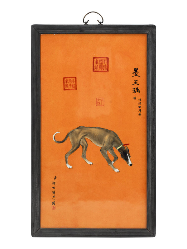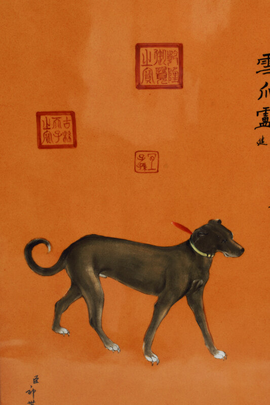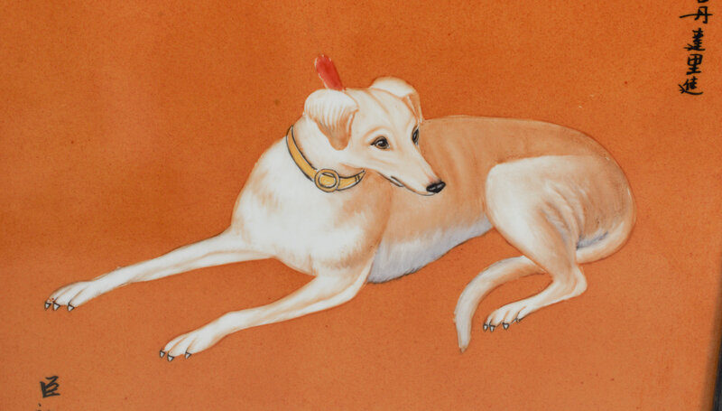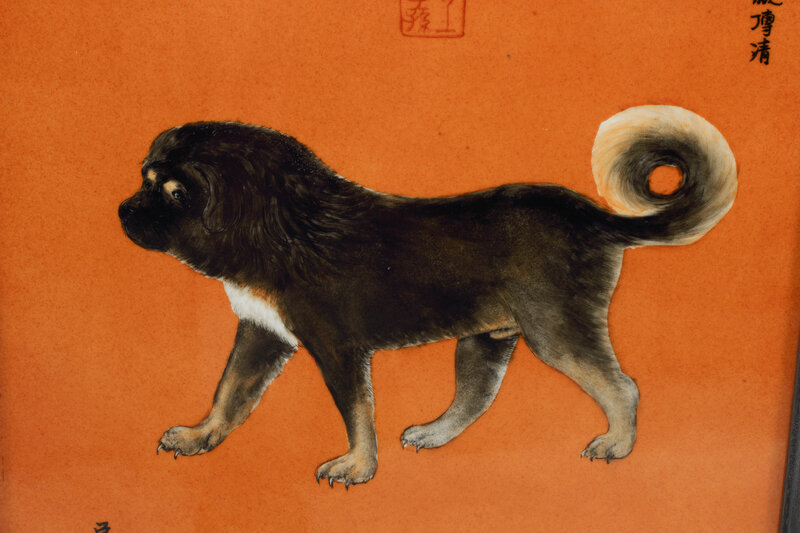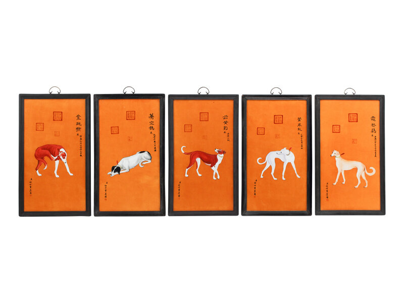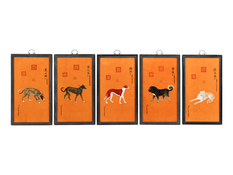 A Set of Ten Framed Chinese Porcelain Plaques Depicting the Emperor's Dogs
