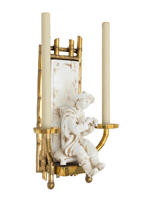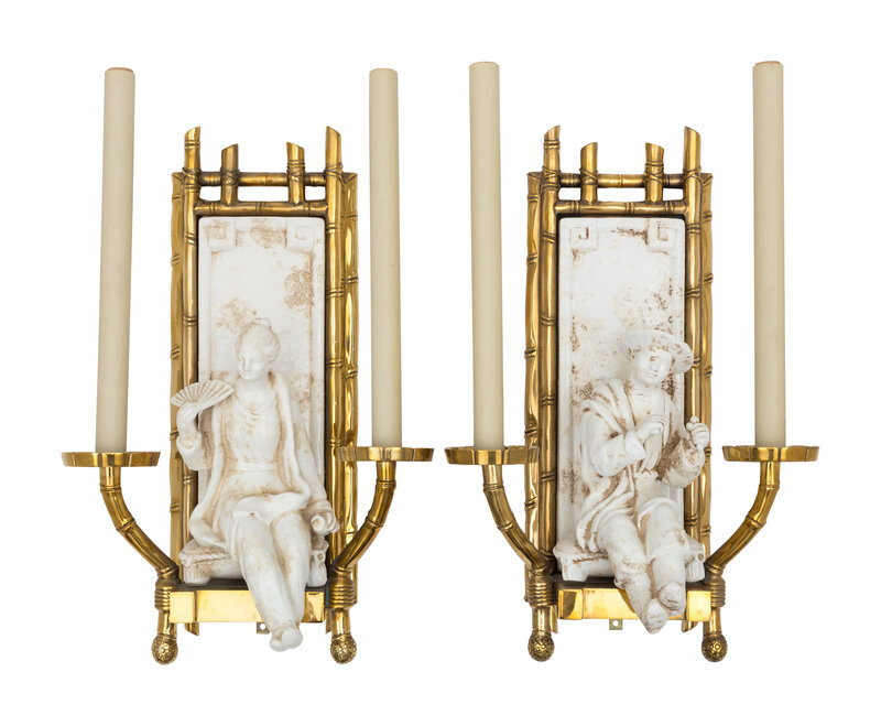 A Pair of Chapman Chinoiserie Brass and Ceramic Two-Light Sconces