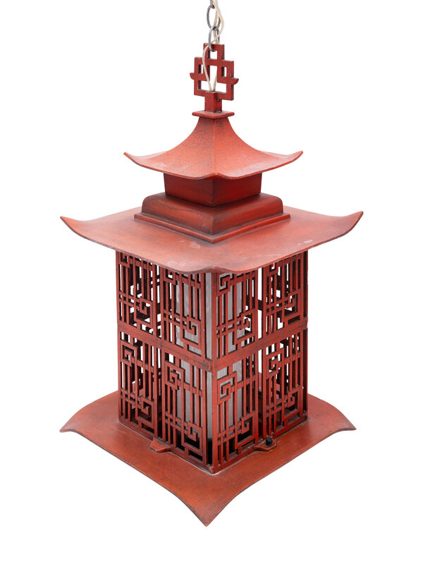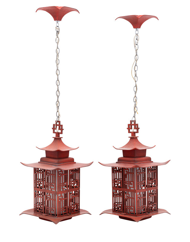 A Pair of Red Tole Pagoda-Form Lanterns