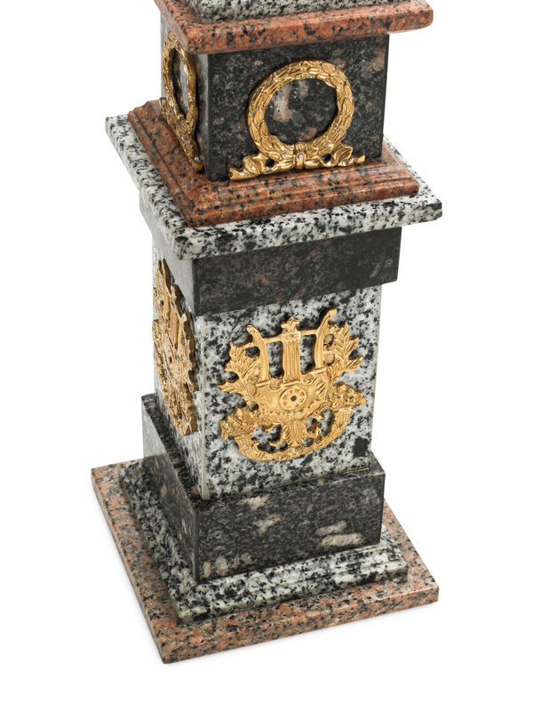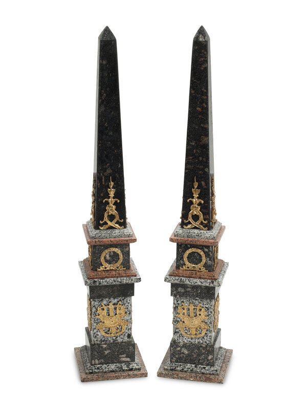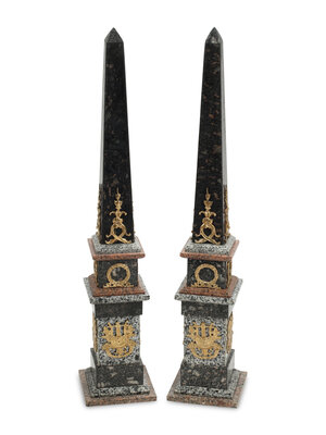 A Pair of Large Gilt Bronze Mounted Vari-Color Granite Obelisks