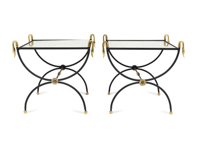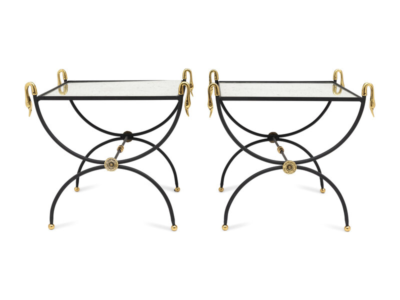 A Pair of Brass-Mounted Metal and Mirror-Top Side Tables