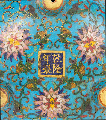 the compressed globular body raised on three short conical legs, the recessed neck surmounted by a gilt mouth rim applied with a pair of upright handles, the body enameled with various lotus scrolls against a blue ground, the underside bearing an apocryphal Qianlong four-character mark within a square.