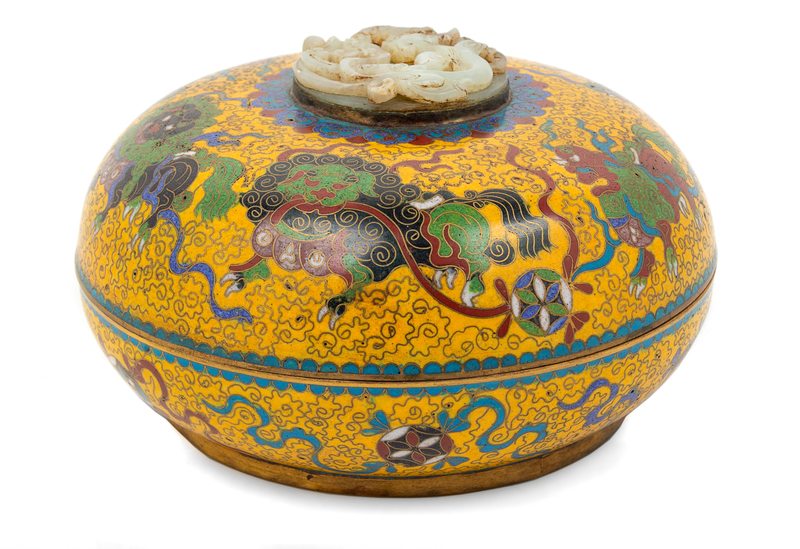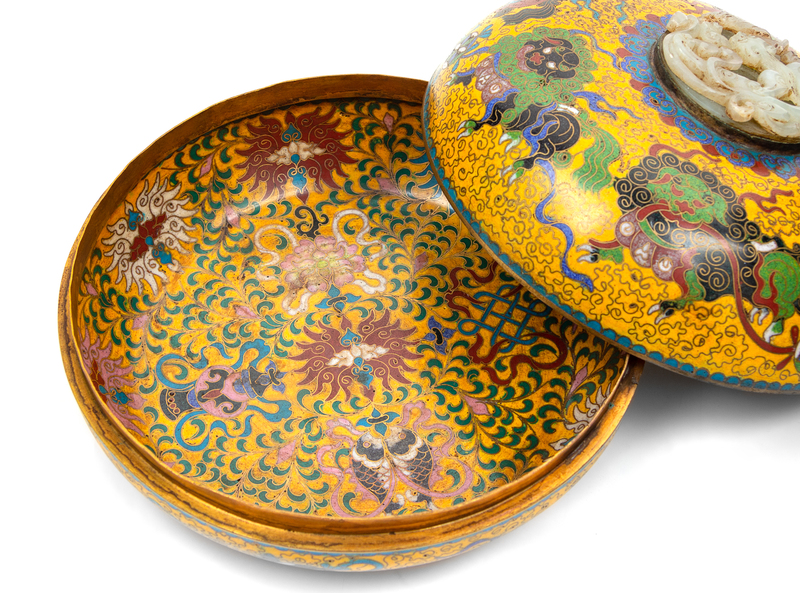 of circular form, the cover inset with a celadon jade plaque with relief carved chilong,s the sides decorated with fu lions playing with brocade balls, the interior enameled with lotus scrolls, all against a yellow ground.