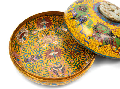 A Celadon Jade Inset Cloisonne Enamel Circular Covered Box Diameter 8 inches.