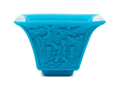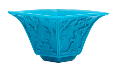 A Turquoise-Blue Peking Glass Square Bowl Height 4 3/8 inches.