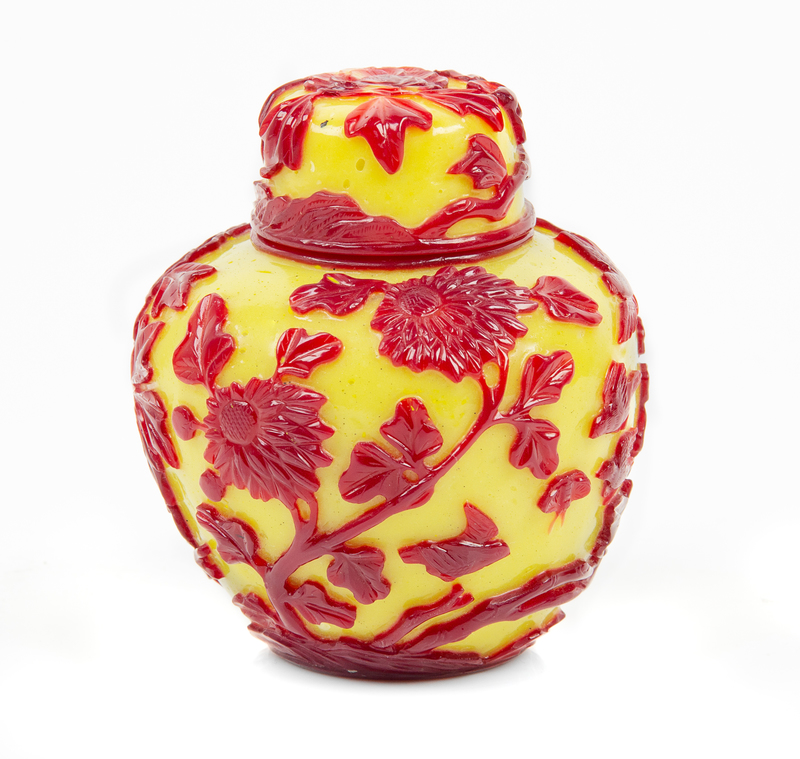A Red Overlay Yellow Peking Glass Ginger Jar and Cover Height 5 inches.