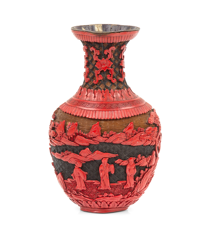 the baluster body resting on a short circular foot ring, rising to a waisted neck and a quatrefoil-form mouth, the main panel carved to show a continuous landscape with scholars and attendants on a bridge, underneath bands of pendant leaves and a keyfret band, the neck decorated with floral scrolls against a diaper ground.