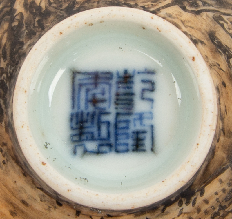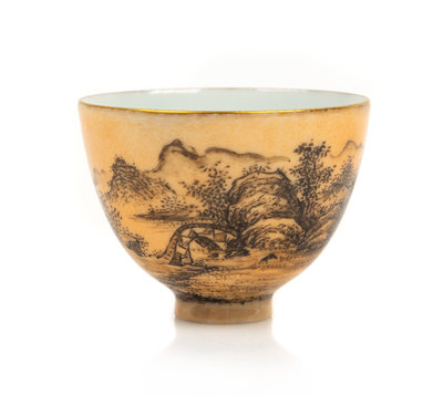 An Apricot Yellow Ground Grisaille Porcelain Wine Cup Diameter 2 1/2 inches.