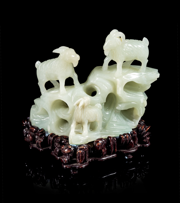 A Pale-Celadon Jade Carving of Three Rams Height 4 1/8 inches.
