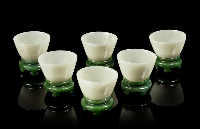 A Set of Six Celadon Jade Wine Cups and Stands Diameter of each 2 3/4 inches.