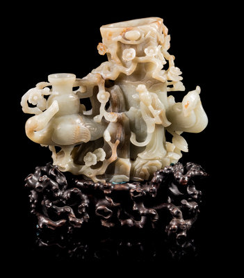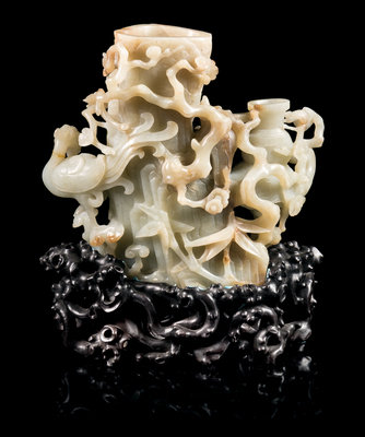 depicting a vase imitating rockworks, partially conjoined with a smaller baluster vase, carved to the exterior in high relief showing flowering prunus trees, a standing scholar playing a flute between a standing pheasant and a duck, raised on a fitted rosewooed stand finely carved with gnarled branches.