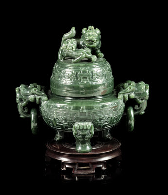 the compressed globular body carved with stylized taotie masks, raised on three cabriole legs decorated with beast heads, flanked by a pair of dragon head-form handles and suspending loose rings, the dombed cover decorated with confronting kuilong and topped with a recumbent qilin- form finial. further raised on a fitted hardwood stand.