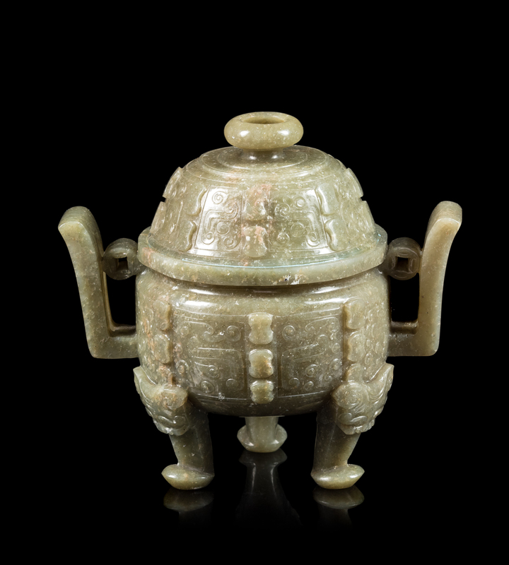 having a compressed globular body on three incurved legs decorated with beast masks, the exterior carved in relief showing stylized taotie masks interspersed with raised flanges, set with a pair of upright handles.