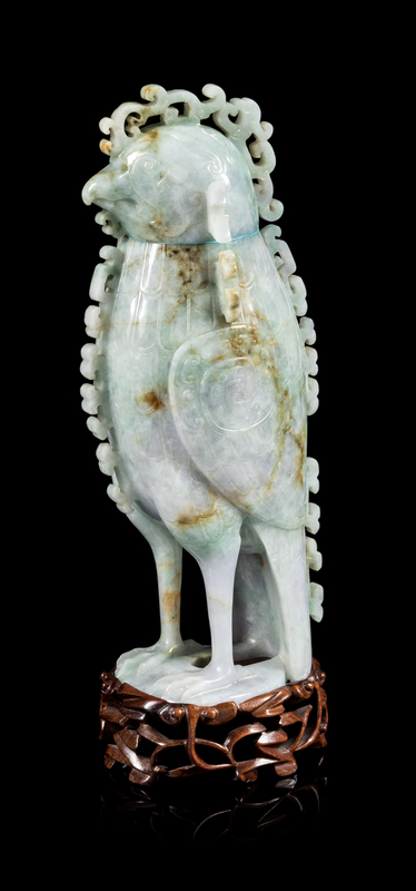 A Jadeite Phoenix-Form Covered Vessel Height 5 3/4 inches.