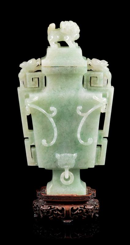 An Apple Green and Pale Celadon Jadeite Covered Vase Height 9 1/2 icnhes.