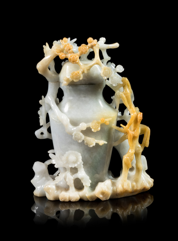 A Russet and Pale Celadon Jadeite Covered Vase Height 6 inches.