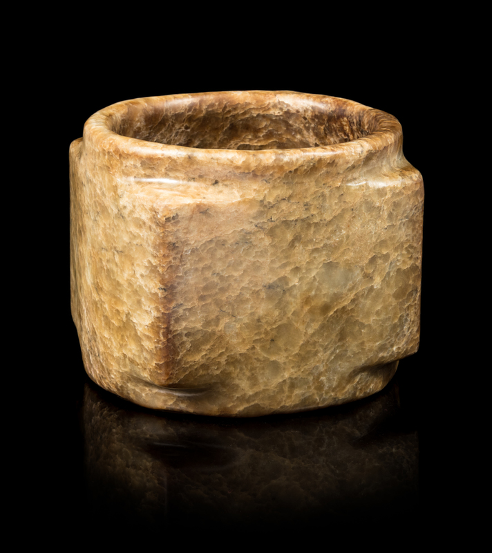 of square section, pierced through the center with a cylindrical tube extending at either end to a short straight neck and foot, the stone of yellowish-brown tone with streaks.