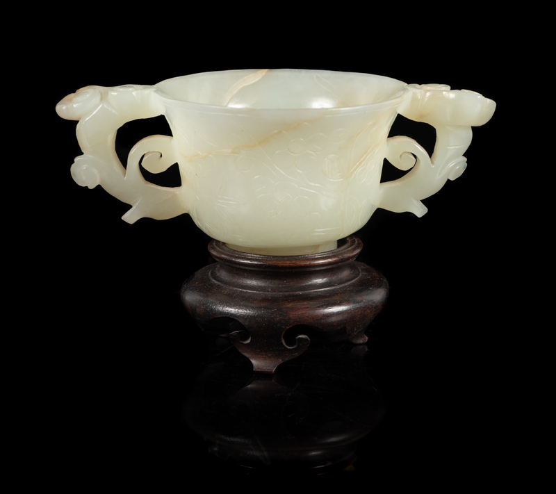 the flaring walls raised on a short circular foot, the exterior with incised decoration, each side carved with a handle in the shape of a lingzhi sprig, raised on a hardwood stand.