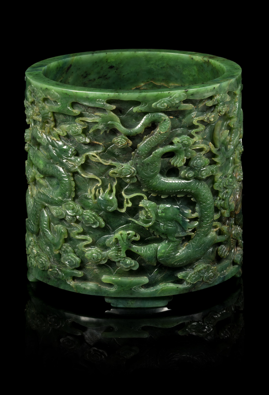 A Spinach Jade 'Dragon' Brushpot, Bitong Height 6 3/8 inches.