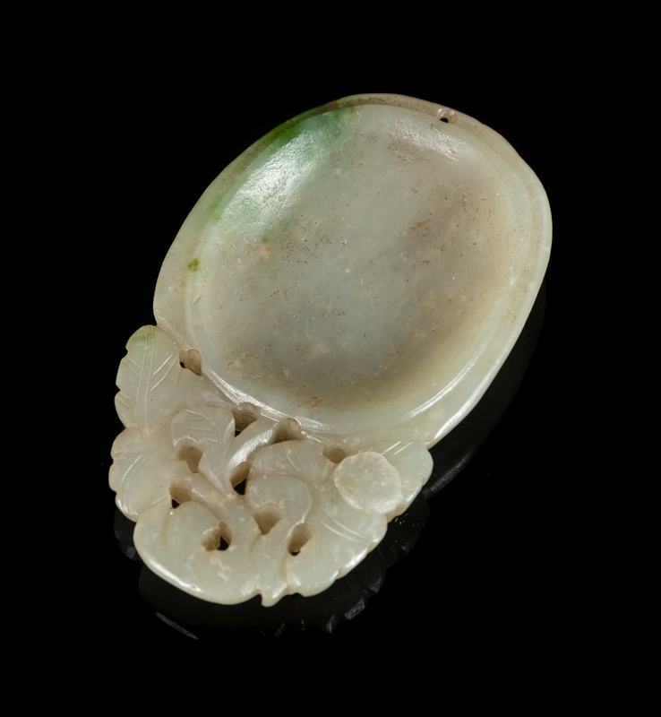 the veins and leaved carved in openwork, the stone in grey tone with dark green streaks.