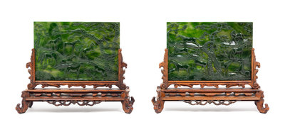A Pair of Carved Spinach Jade Inset Hardwood Table Screens Height of each 13 1/4 x length 14 1/4 inches.
