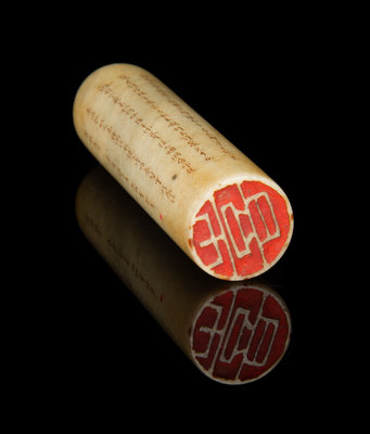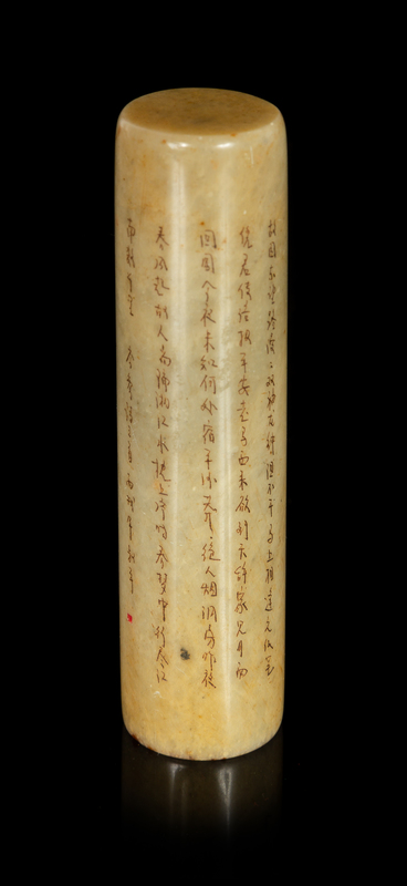 of cylindrical form, incised with three seven-character verses by Cen Shen (715-770).