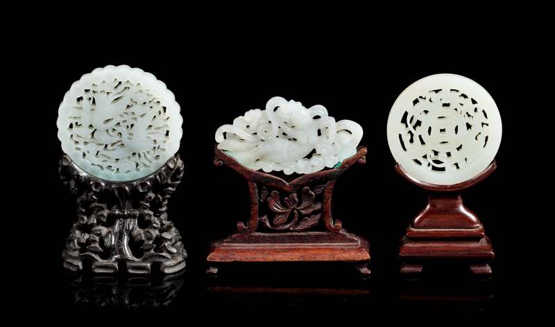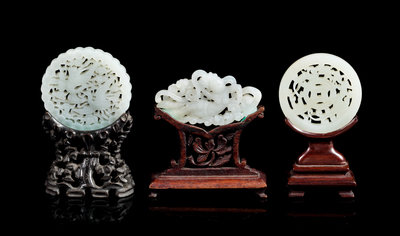 Three Pale Celadon Jade Reticulated Plaques Diameter of largest 2 3/8 inches.