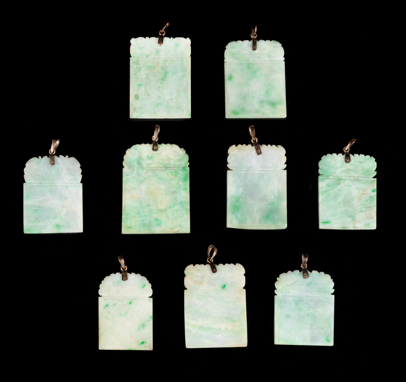 Nine Apple Green and Celadon Jadeite Plaques Length of largest 1 3/4 inches.