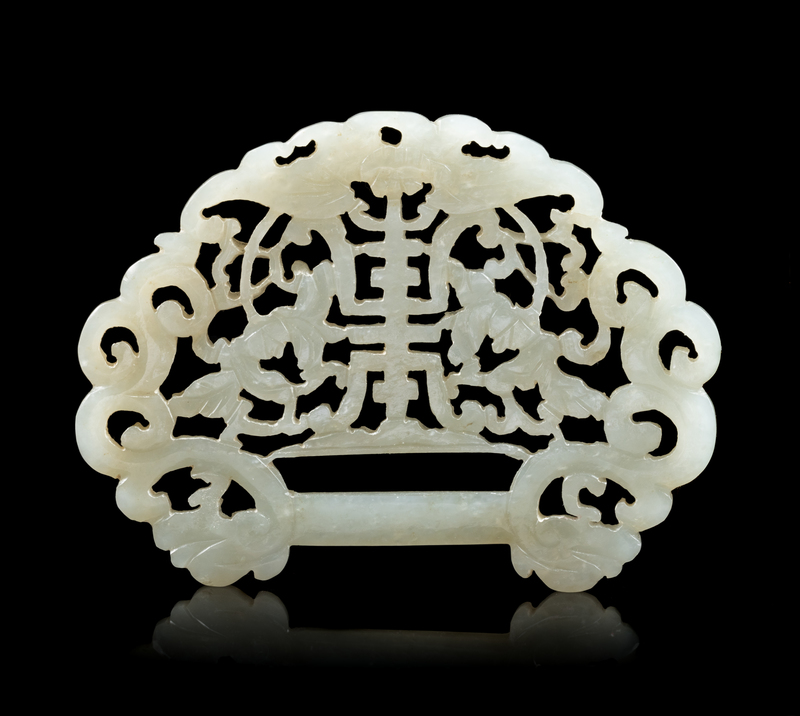 carved and pierced with a shou character amongst scrolling peony sprays and foliage.