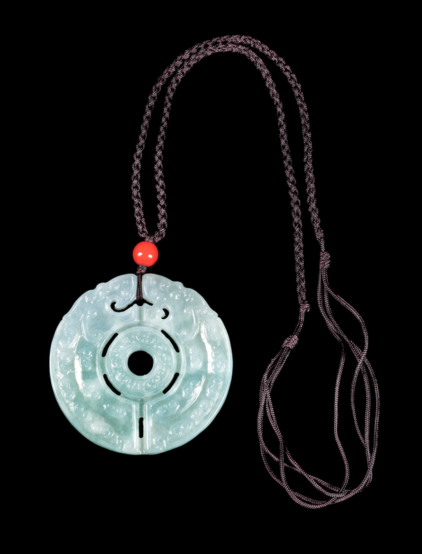 in the circular form with openwork carving of two dragons confronting each other, the stone is of pale celadon color.