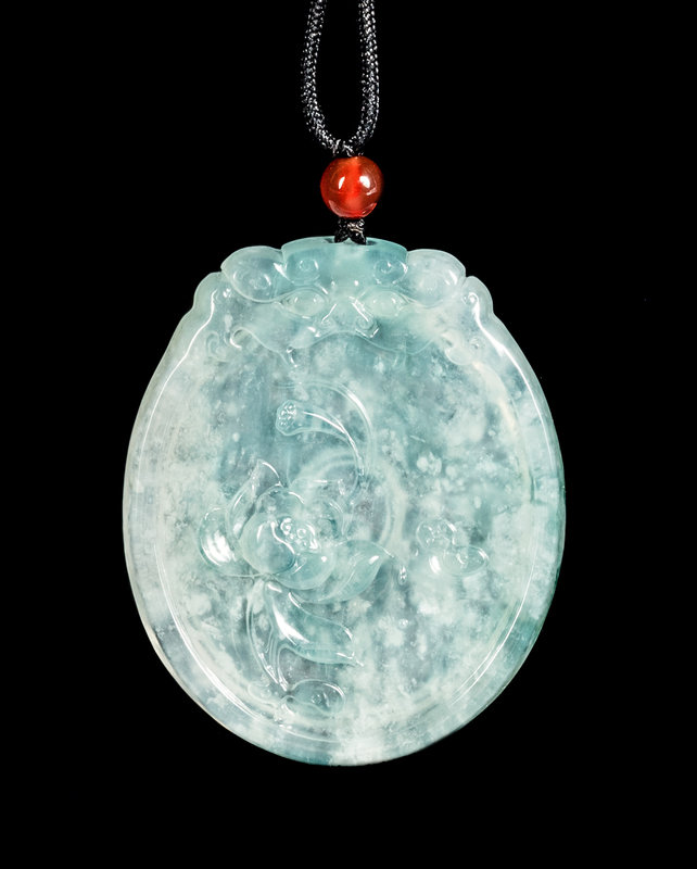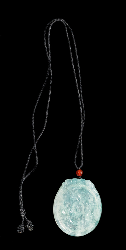 of oval form finely carved with lotus blossom and stems coiled with leaves, the stone is of an even pale celadon tone with icy-white streaks.