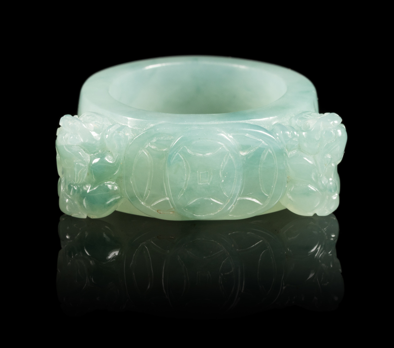 carved with three round coins in the central section with pixiu on each side. The stone is of bright and pale sea-bright tone with subtle evergreen inclusions.