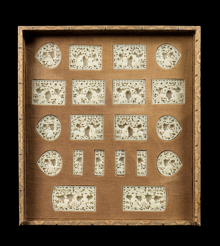 each stone of an even pale green color, comprising two large rounded-rectangular plaques, eight medium-sized rectangular plaques, four small rectangular plaques and six peach-shaped plaques, each carved in open work with a barbarian figure training a tiger, the samllest rectangular and peach-shaped examples with only tigers over openwork leafy branches.