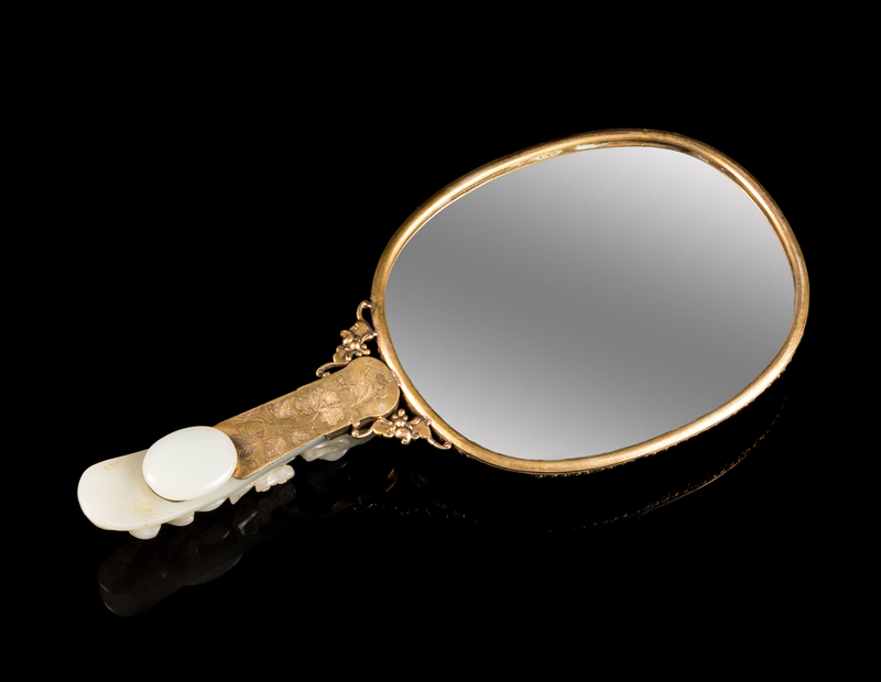 the back of the oval mirror inset with a white jade oval plaque carved with a hanging bat clucthing a ribbon-tied persimmon, enclosed by the silver frame chased with Daoist emblems alternating green hardstone insets, a pale celadon jade dragon-head belt hook forming the handle flanked by a pair of winged bats.