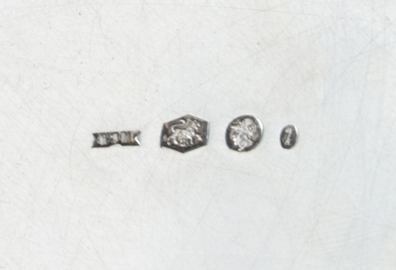 the oval plaque carved to the front depicting a ribbon-tied canopy, a lotus sprig, a gourd-form vase and a cat fish surrounding a bat above two peaches, the floriform box with four silver marks.