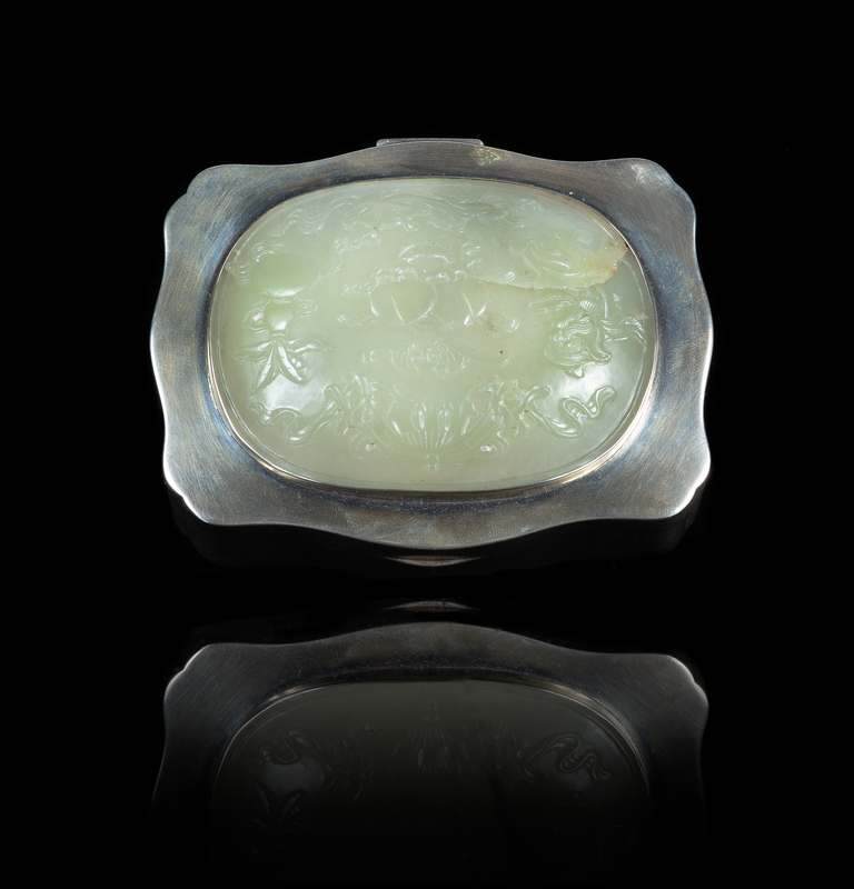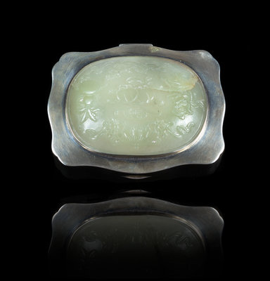 A White Jade Inset Silver Hinged Box Width of jade 3 1/2 x depth 2 5/8 inches; width of box 4 3/8 inches.