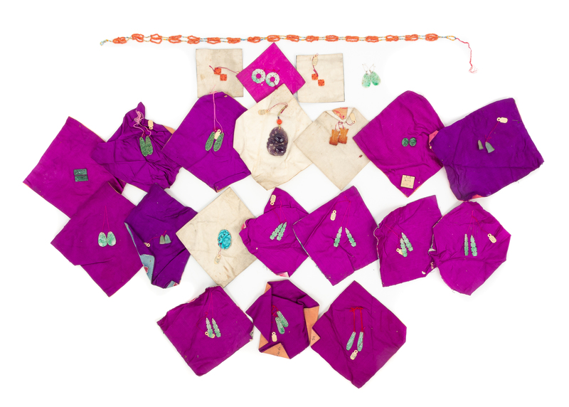 comprising a coral and glass necklace, sixteen pairs of jadeite pendants, two pairs of agate pendants, one amethyst pendant and one turquoise pendant.