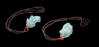 each finely carved as a pixiu, the stones are of bright and pale sea-bright tone with subtle evergreen inclusions.
