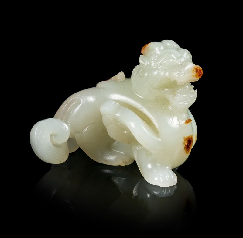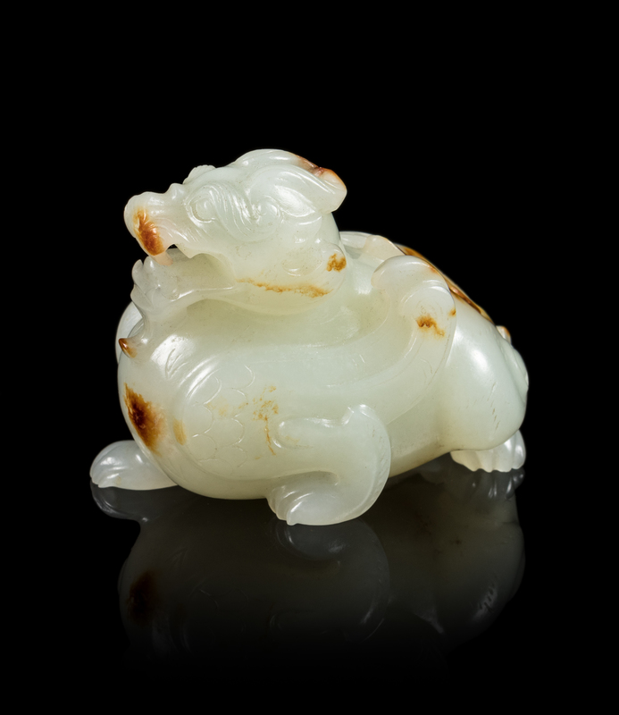A Celadon and Russet Jade Carving of a Mythical Beast, Bixie Length 1 5/8 inches.