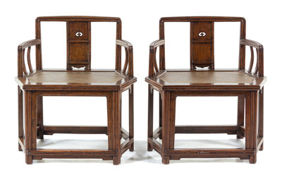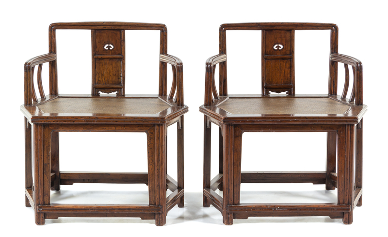 A Pair of Yumu Hexagonal Armchairs Height 33 x length 30 1/2 x width 20 1/2 inches.