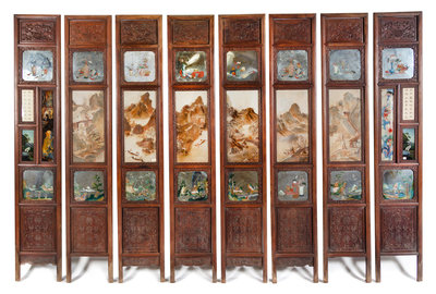 A Porcelain and Glass Inset Hardwood Eight-Panel Floor Screen Height 91 x width 15 3/4 (each panel).